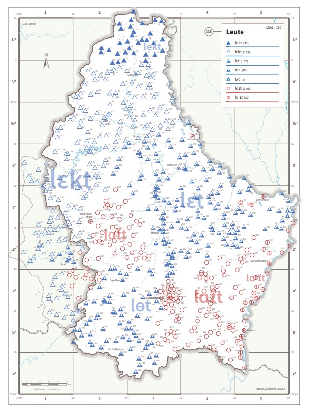 De Lëtzebuerger Sproochatlas 1900 geet der Fro no, wéi zu Lëtzebuerg geschwat gouf an zum Deel nach ëmmer geschwat gëtt: Seet ee Léckt, Läckt, Lätt, Lëtt, Latt, La-it oder Leit? Gebraucht een anescht oder anischt, ass et fir een e Gesit, Gesiicht oder e Gesiischt?