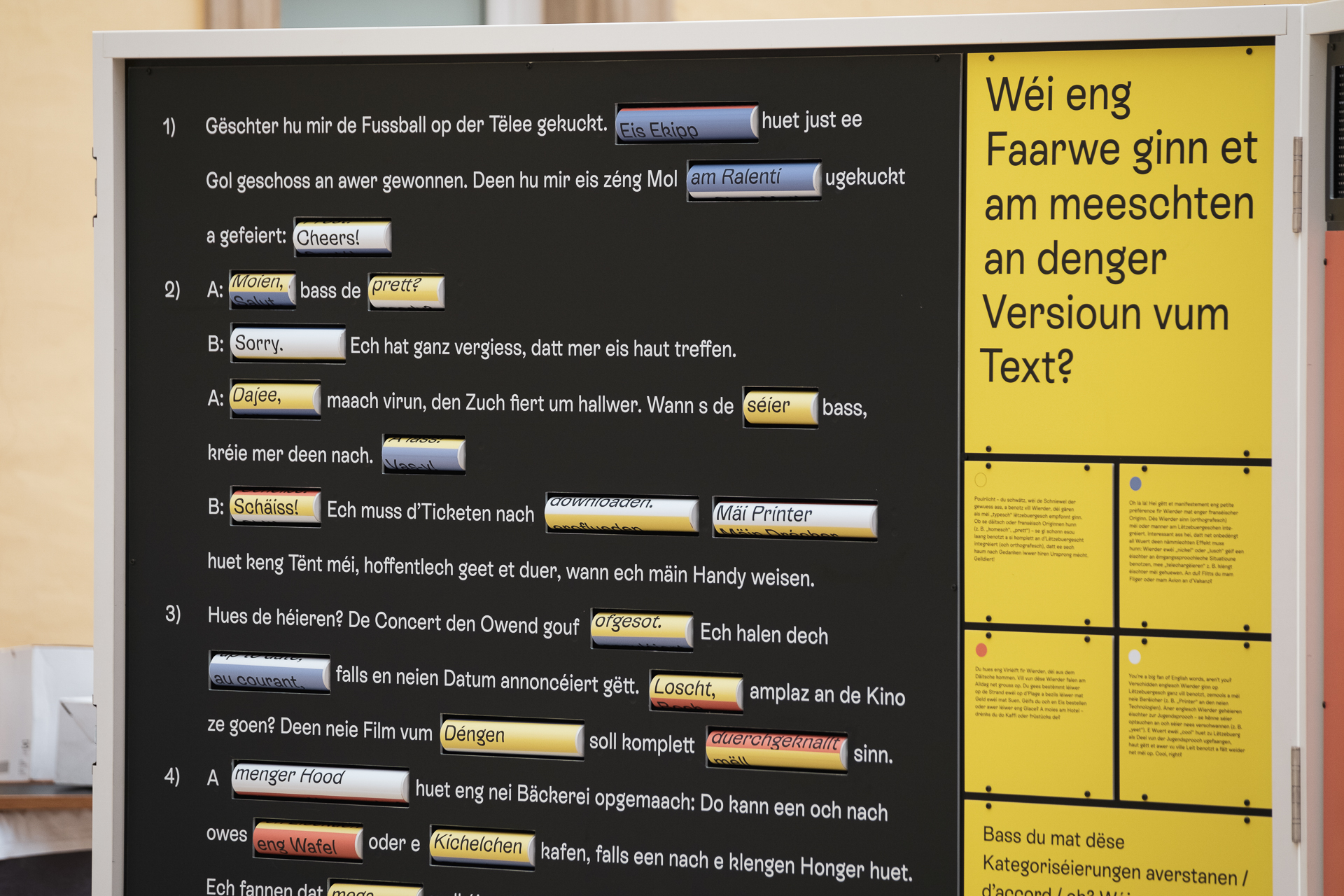 Den Titel vun der Ausstellung „D’Lëtzebuerger Sprooch(en)“ ass bewosst méideiteg a soll déi komplex Sproochesituatioun zu Lëtzebuerg erëmspigelen.