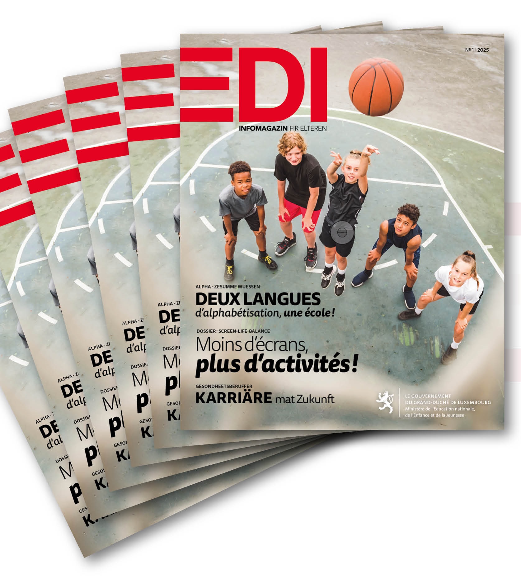 EDI-Infomagazin fir Elteren est publié par le ministère de l’Éducation nationale, de l’Enfance et de la Jeunesse deux fois par an et vise à informer les parents sur la politique éducative et les projets qui concernent tous les domaines d’action du ministère : les structures d’éducation et d’accueil, les écoles fondamentales, les lycées, la formation professionnelle, l’enseignement musical, la promotion de la langue luxembourgeoise, les compétences digitales, etc.