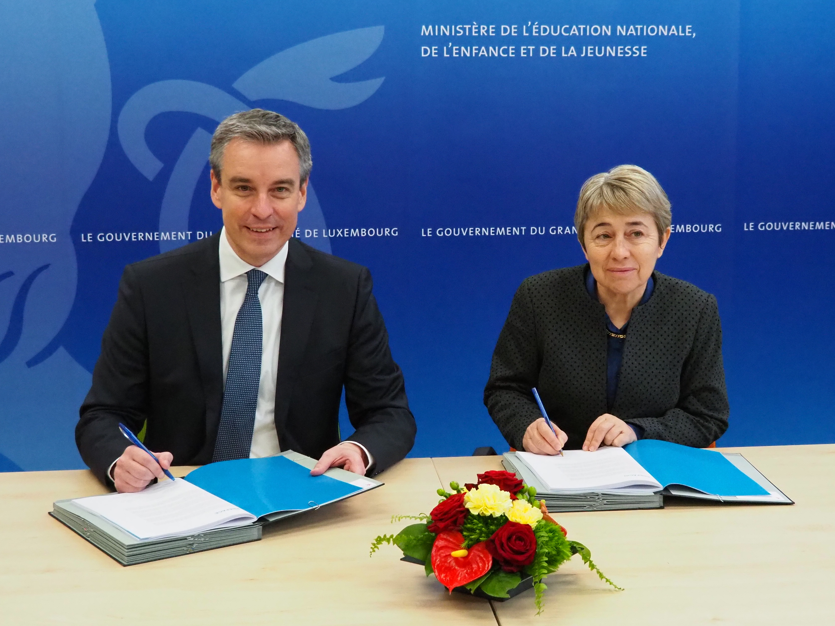 Dans le cadre de l’entrevue, Claude Meisch et Berta Nunes ont signé le cadre de référence des cours complémentaires de langue portugaise. Cette nouvelle formule de cours est offerte depuis 2017/2018 à l’enseignement fondamental aux élèves lusophones des cycles 2 à 4, en dehors de l’horaire scolaire, à raison de deux leçons par semaine. Le cadre de référence définit le programme spécifique enseigné dans ces cours, qui fait le lien entre le plan d’études luxembourgeois et le programme portugais de l’Institut Camões. Fruit d’un minutieux travail entre les deux parties, ce document phare concrétise l’engagement des deux gouvernements à l’égard de la langue portugaise et l’éveil aux cultures du monde lusophone.