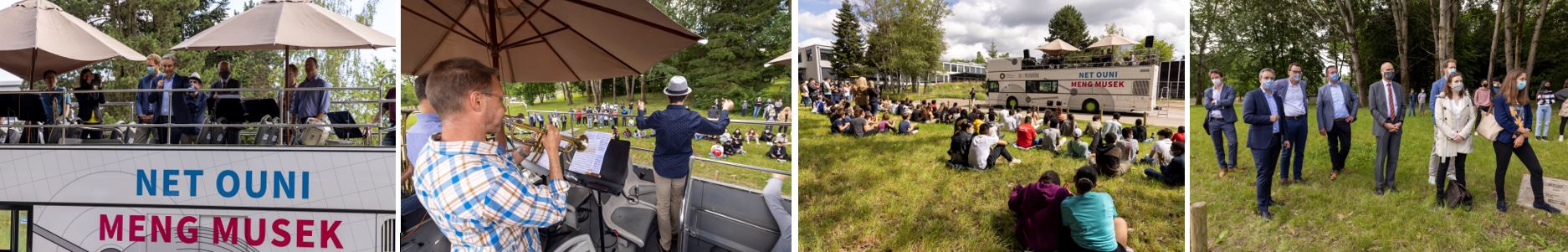 Depuis le 19 juin, le bus de l’OPL est à nouveau sur la route pour une mission musicale. Durant trois week-ends, les musiciens de l’orchestre ont donné de petits concerts publics en plein air et se sont arrêtés dans tout le pays, d’Ettelbrück à Esch. Pendant deux semaines, le bus s’est également rendu dans 18 écoles secondaires. Lors du concert d’aujourd’hui au Lycée Technique du Centre Kirchberg, Claude Meisch, ministre de l’Éducation nationale, de l’Enfance et de la Jeunesse, a fait l’honneur de sa présence.