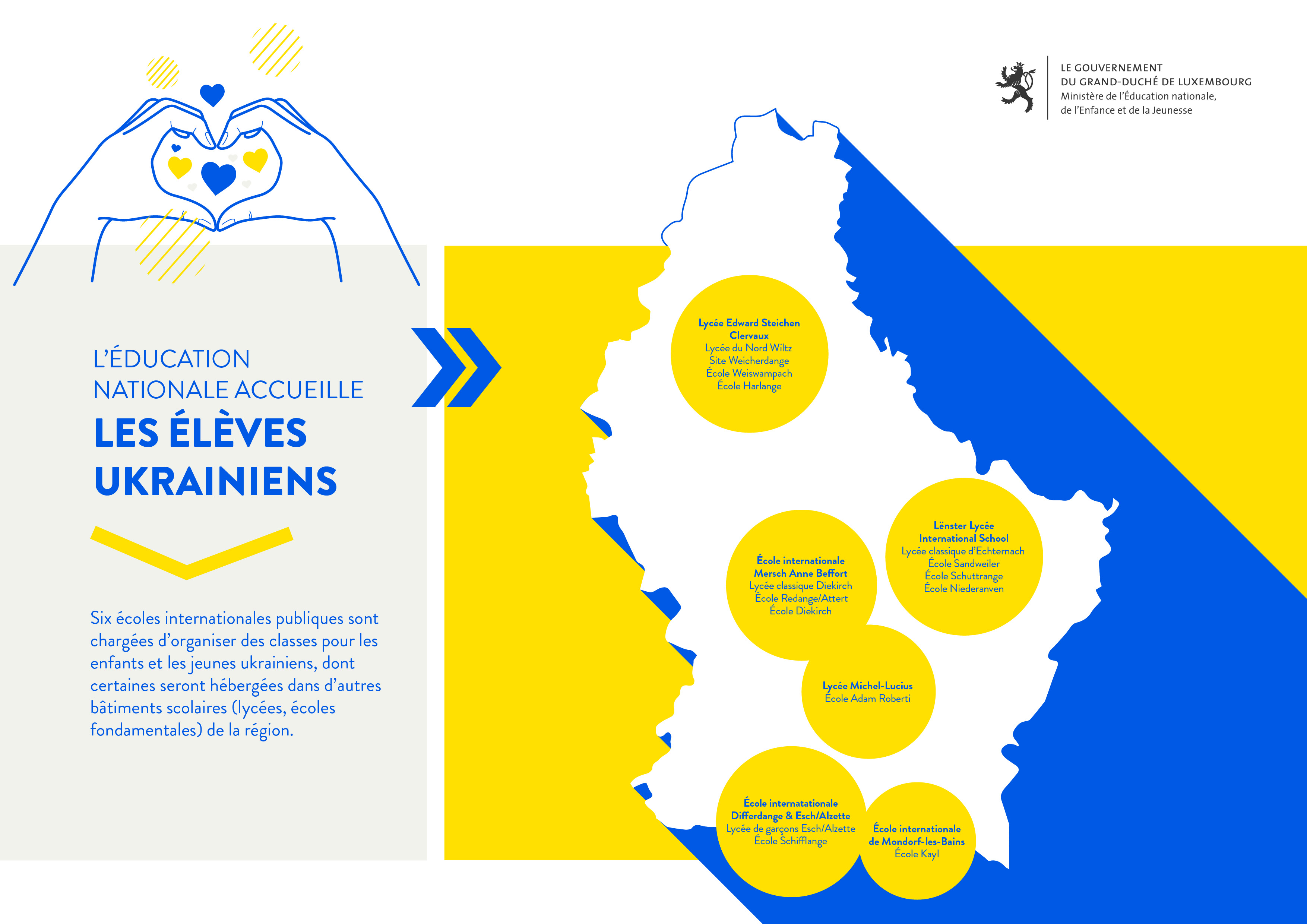 Le Luxembourg bénéficie déjà d’une large expérience en matière d’accueil d’élèves nouvellement arrivés au pays. Le ministère de l’Éducation nationale, de l’Enfance et de la Jeunesse met maintenant tout en œuvre pour faire face à cette augmentation inédite du nombre de primo-arrivants et proposer une offre de scolarisation adaptée à la diversité des profils des élèves ukrainiens.