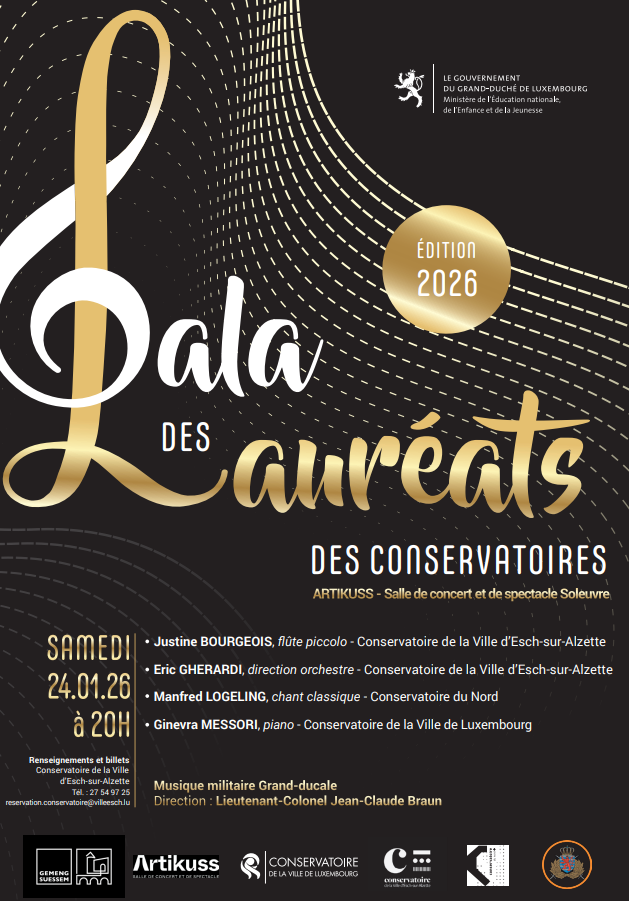 Issus des trois conservatoires du Grand-Duché de Luxembourg, les meilleurs élèves lauréats de l‘examen national pour l’obtention du diplôme supérieur de l’année scolaire 2024/2025 seront mis en valeur à l’occasion d’une soirée de gala, le samedi 24 janvier 2026 à 20 heures à la salle de concert et de spectacle Artikuss à Soleuvre.