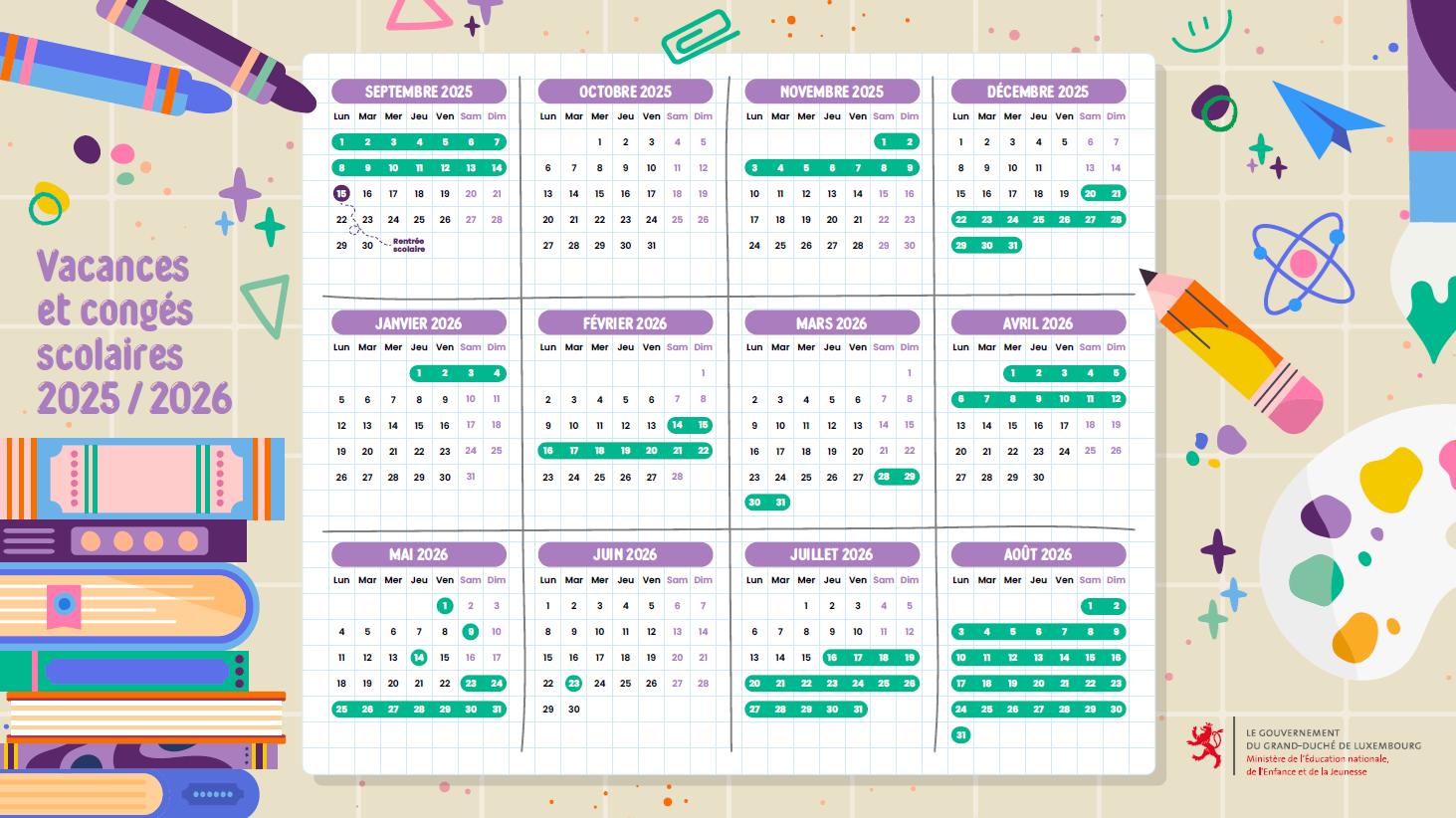Pour l’année scolaire 2025/2026, l’année débute le lundi 15 septembre 2025 et finit le mercredi 15 juillet 2026. Le calendrier est le suivant :